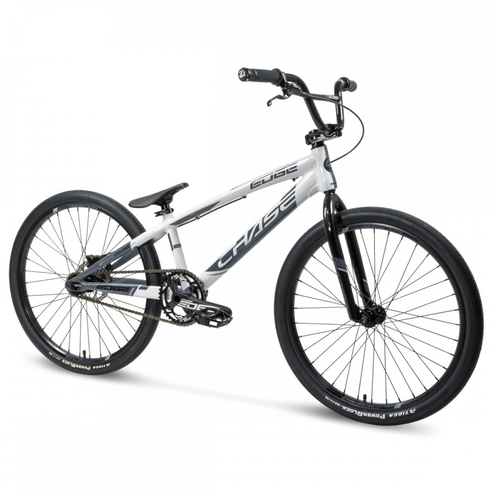 The all new CHASE Edge is a race ready BMX machine, ideal for riders ready to get serious about BMX racing and take it to the next level.Just when you didn't think it was possible, the new Edge has been improved, as now it is equipped with Shimano Hydraulic disc brakes (Junior size & above), all new Chase 24mm 2 piece Alloy Cranks (Expert XL & Above) , updated gearing and crank sizes, a 2 tone paint and graphics design, and an closed rear dropout system with integrated chain tensioner system,. The Edge frame also features hydroformed, triple butted, 6061 aluminum tubes with an integrated head tube. Other featured parts on the Edge include 4130 chromoly fork and handlebars, double wall rims with triple engagement rear cassette rear hub, and TIOGA tires. The combination of all these components arguably makes the CHASE Edge one of the most advanced race BMX bikes available today.