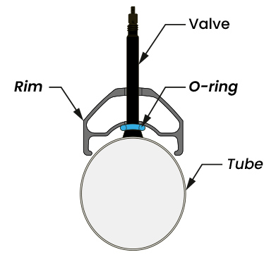 Included with the ultralight tube is a Pinch Prevention O Ring. This O Ring is to be installed between the tube valve base and the inside the of the rim valve hole. This will help with Pinch Prevention on the tube as well as help keep the tube secure in the correct location directly under the valve hole.